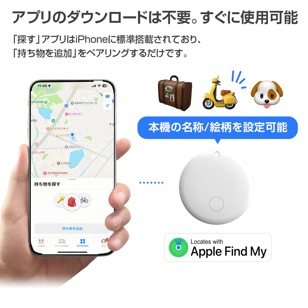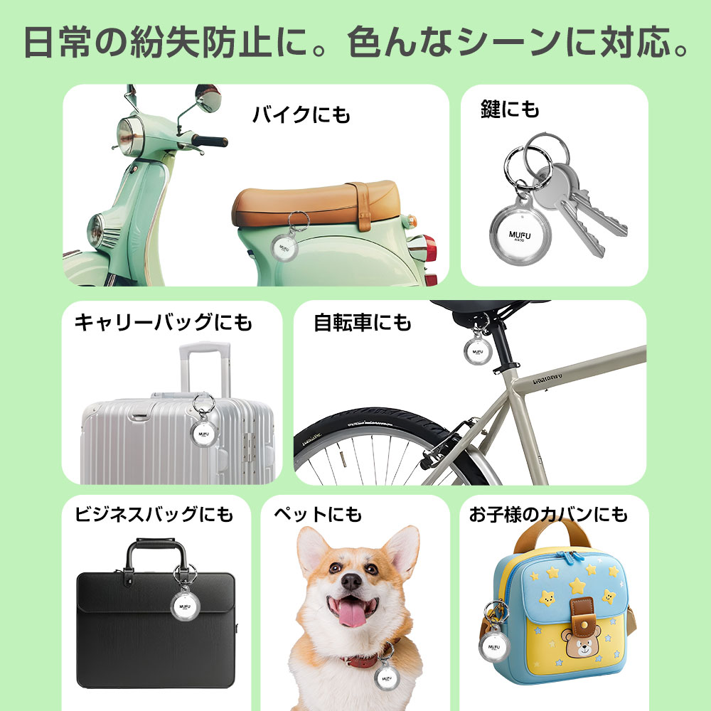 車やバイクの鍵、車両の位置、子供や高齢者の見守り、ペットなど、色々なアイテムに対応でき、簡単に追跡することができます。