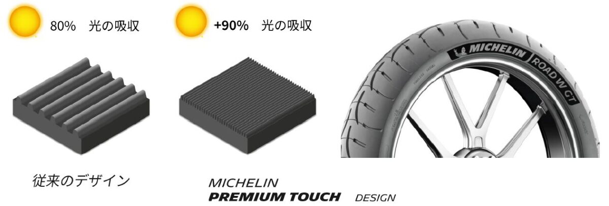 サイドウォールに施されたMICHELIN Premium Touch Designはベルベット調の効果によりコントラストが強調され、より深みのある黒の陰影を作り出しています。