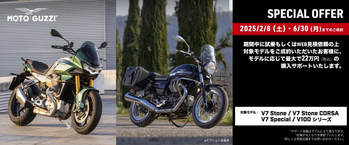 ピアッジオグループジャパン株式会社は、モト・グッツィのモデルを、お得に購入できるサポートキャンペーン『SPECIAL OFFER』を2025年2月8日(土)から6月30日(月)まで、全国のモト・グッツィ正規販売店にて実施する。