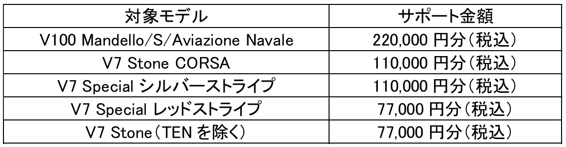 キャンペーン内容 : キャンペーン期間中に正規販売店にてモト・グッツィをご試乗の方、もしくはモト・グッツィ公式HPより見積依頼をされた方が、期間中に対象モデルの新車をご成約された場合、モデルに応じた購入サポート金をプレゼント※2いたします。