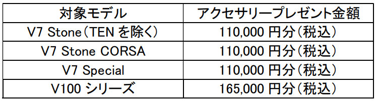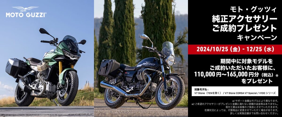 ピアッジオグループジャパン株式会社(本社:東京都港区芝二丁目、代表取締役:ネリ・ミクラウス)は、モト・グッツィが誇る唯一無二の走りを一層楽しく便利にする純正アクセサリーを、V7 シリーズと V100 Mandello をご成約いただいたお客様に、110,000 円~165,000 円分(税込)※をプレゼントするキャンペーンを、2024 年 10 月25 日(金)から 12 月 25 日(水)まで、モト・グッツィ正規販売店にて実施いたします。