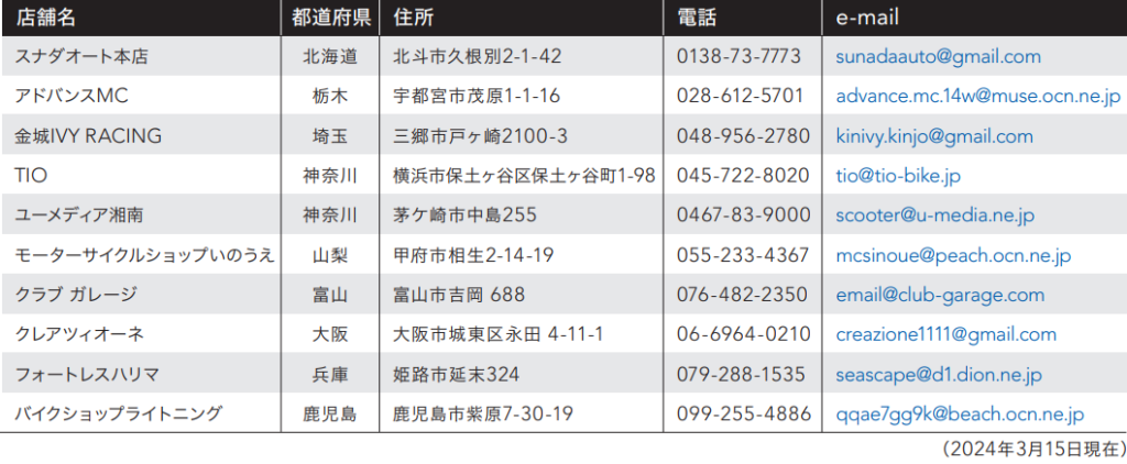 MV Agusta サービスパートナーは、北海道から九州まで日本全国を網羅した10店舗でのスタートとなります。