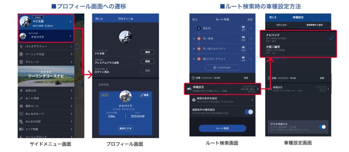 株式会社ナビタイムジャパン(代表取締役社長:大西 啓介、本社:東京都港区)は、2025年4月25日(金)より、バイク専用ナビゲーションアプリ『ツーリングサポーター by NAVITIME』の「プロフィール」機能を拡充し、複数台のバイク登録に対応します。これにより、各車両に応じた排気量やETC料金を考慮したルート検索が可能となります。