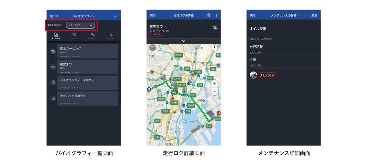 登録したバイクは、ルート検索だけでなく、「 バイオグラフィ」(走行記録の振り返り)機能とも連動されるため、バイクごとに走行ログやメンテナンス履歴、カスタマイズ内容などを、まとめて管理することもできます。