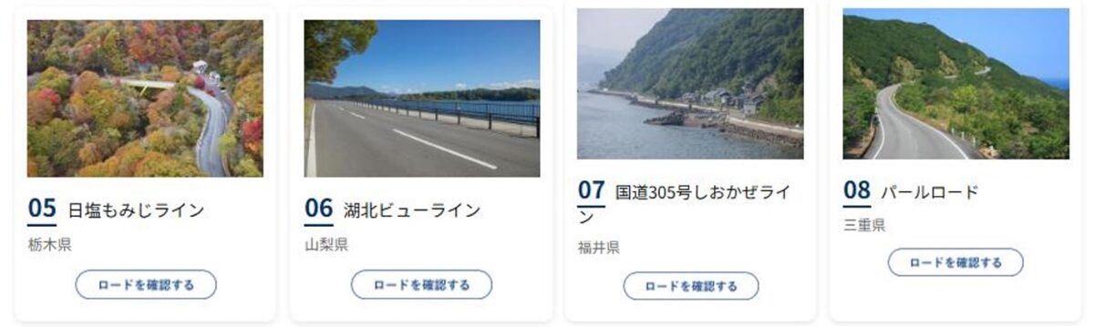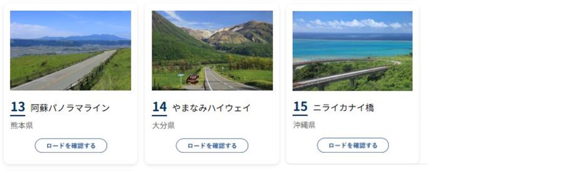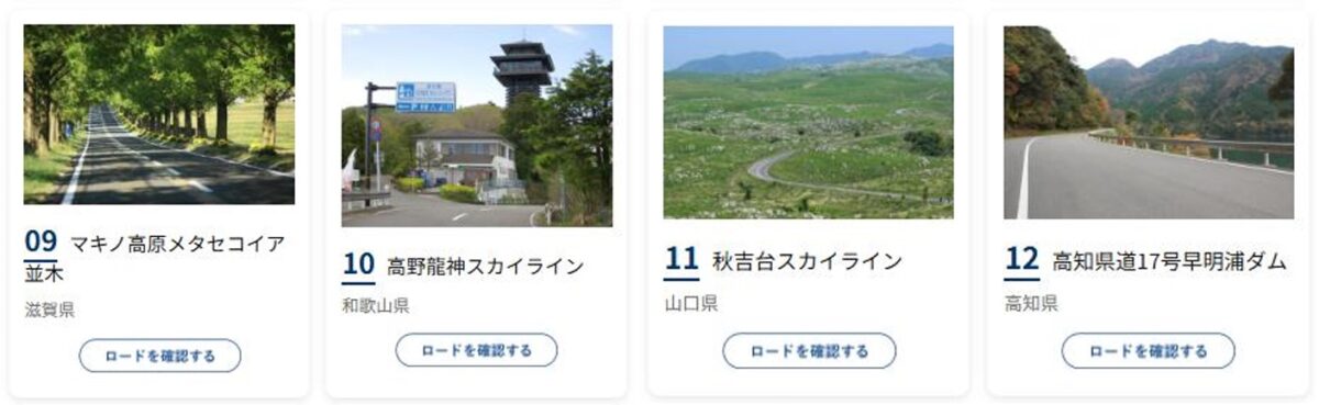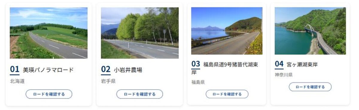 福島県道9号猪苗代湖東岸(福島)や宮ヶ瀬湖東岸(神奈川)、湖北ビューライン(山梨)、マキノ高原メタセコイア並木(滋賀)、阿蘇パノラマライン(熊本)などの全15ロードが対象です。