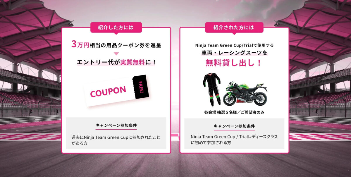 2025年は、Ninja Team Green Cup全5戦のうち、第4戦 SPA直入、第5戦モビリティリゾートもてぎの2戦でレディースクラスを開催する。そして、同キャンペーンは、紹介者には3万円分の用品クーポン、初参加の紹介者には車両とレーシングスーツの無料貸出特典(抽選)が用意されている。レース未経験者でも気軽に参加できる環境が整っているため、興味のある方は詳細をチェックしてみてはいかがだろうか。