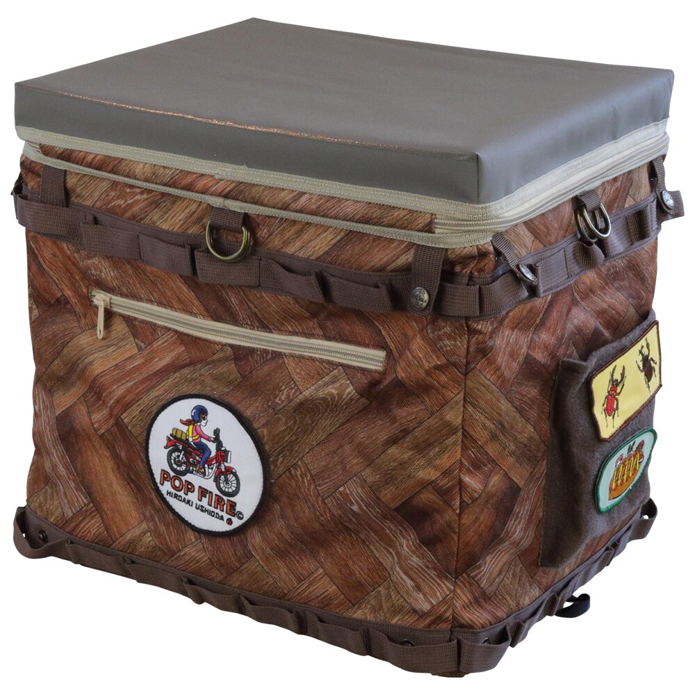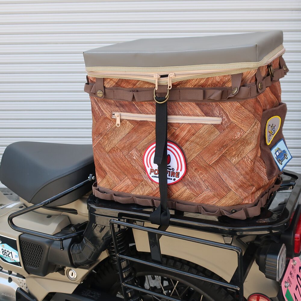 縁あってJGとコラボ ぬくもりのある登場人物にマッチする2色のウッド模様 ベルクロ付きのパッチは移動や変更でカスタマイズしよう 保冷機能付きインナーバックも総柄プリントとこだわり満載 機能は983同様 畳めばタンデムシート。起こせば大容量ケース 買い出し用インナートートと友達への説明が楽しすぎるギヤだ