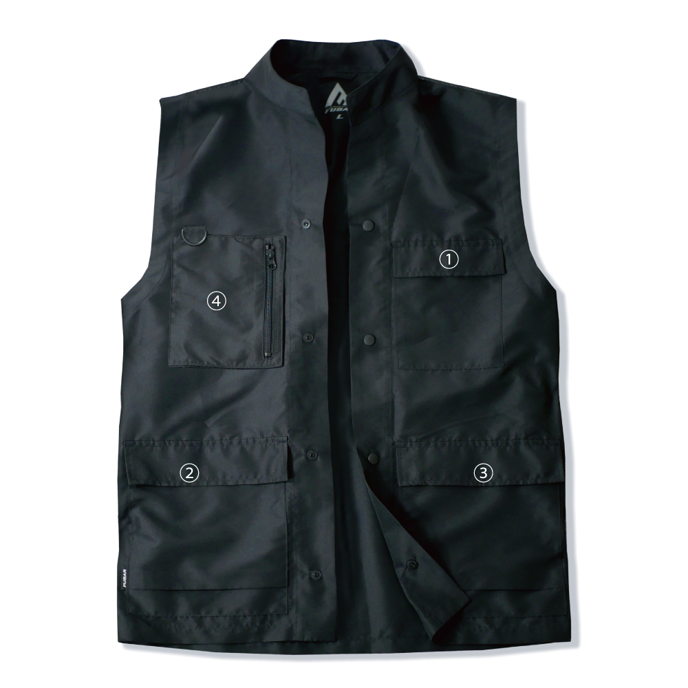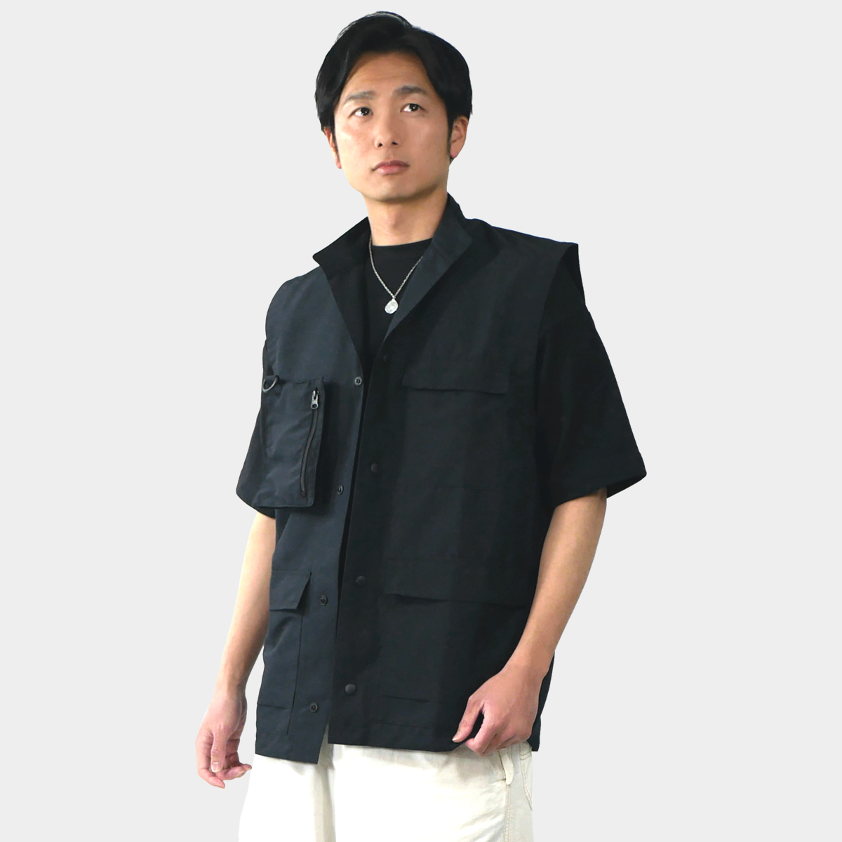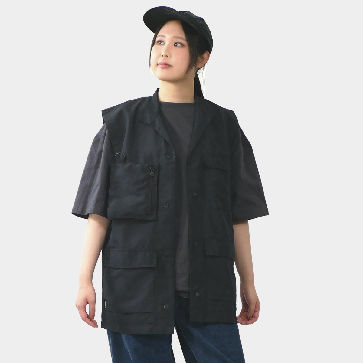 ワークやアウトドア、普段着などあらゆるシーンで着用できるマルチユースウェアで、更には季節を問わないオールシーズン対応モデルです。カーゴベストには珍しい取り外し可能なポケットがついており、ポケットがバッグやサコッシュに変身する遊び心溢れたアイテムとなっています。