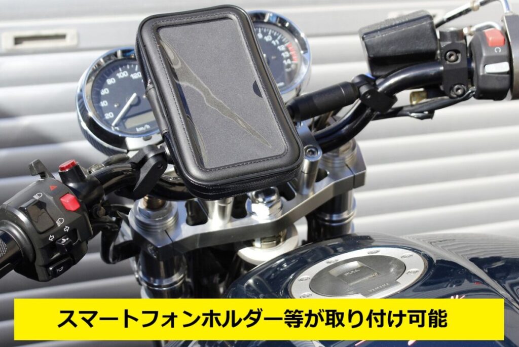 一般的なハンドルバーと同径ですのでハンドル用スマートフォンホルダーなどが取り付け可能です。