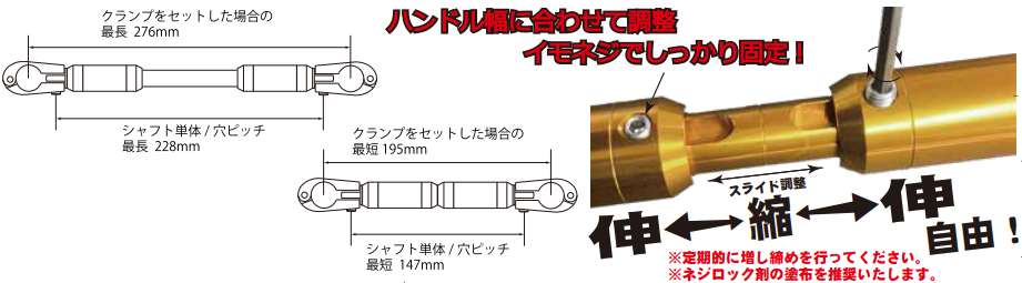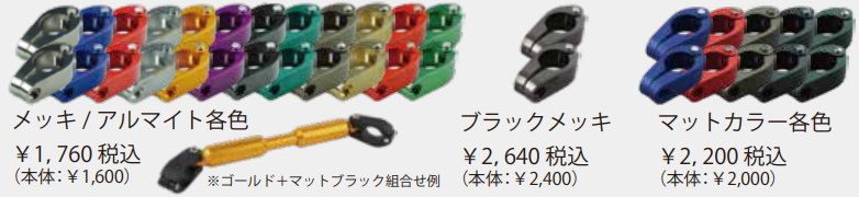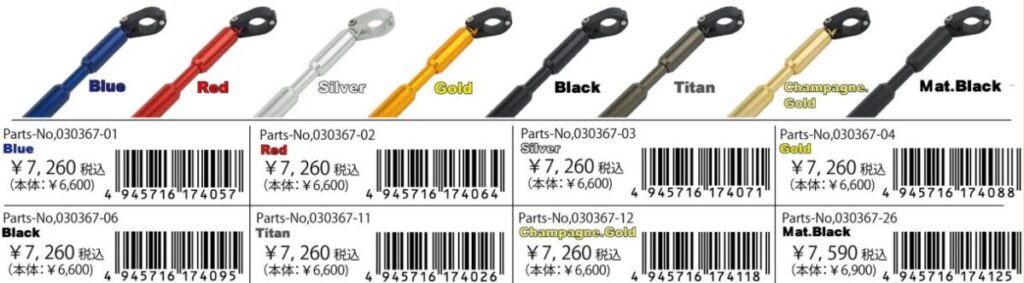 同製品は、調整式タイプで様々な幅のハンドルに取り付け可能となり、イモネジでしっかり固定できるのが特徴だ。シャフト両サイドはΦ22.2㎜でスマホホルダーなどの装着も可能となっている。カラーは8色展開で、シャフトのみの販売も行っている。