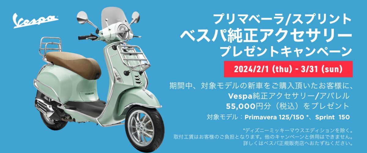 ピアッジオグループジャパン株式会社は、プリマベーラシリーズとスプリント150を購入したユーザーに、55,000 円(税込)分の純正アクセサリーをプレゼントする購入サポートキャンペーンを実施する。