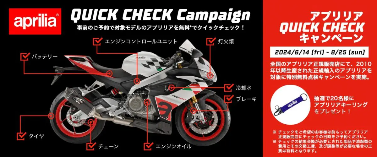 ピアッジオグループジャパン株式会社(本社:東京都港区芝二丁目、代表取締役:ネリ・ミクラウス)は、2024年 6 月 14 日(金)から 8 月 25 日(日)まで、お客様のアプリリアを無料で点検する『アプリリア クイックチェックキャンペーン 2024』を全国のアプリリア正規販売店にて実施いたします。