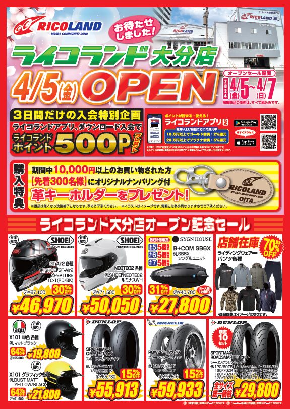 株式会社コシダテックは、バイク用品総合専門店「RICOLAND(ライコランド)」のフランチャイズチェーンを運営している株式会社KMC南日本が、新たに「ライコランド大分店」を2024年4月5日よりオープンすると発表した。