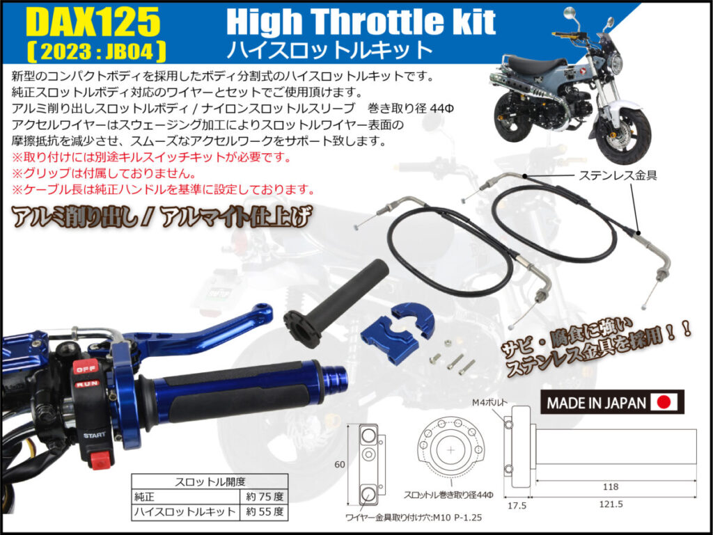 同製品は、スウェージング加工によりスロットルワイヤー表面の摩擦抵抗を減少したアクセルワイヤーにより、スムーズなアクセルワークを補助してくれるのが特徴だ。今回新発売したモデルは、「DAX125用」と「GSX-R125用」となり、いずれも7色展開で、価格は18,700円(税込)。