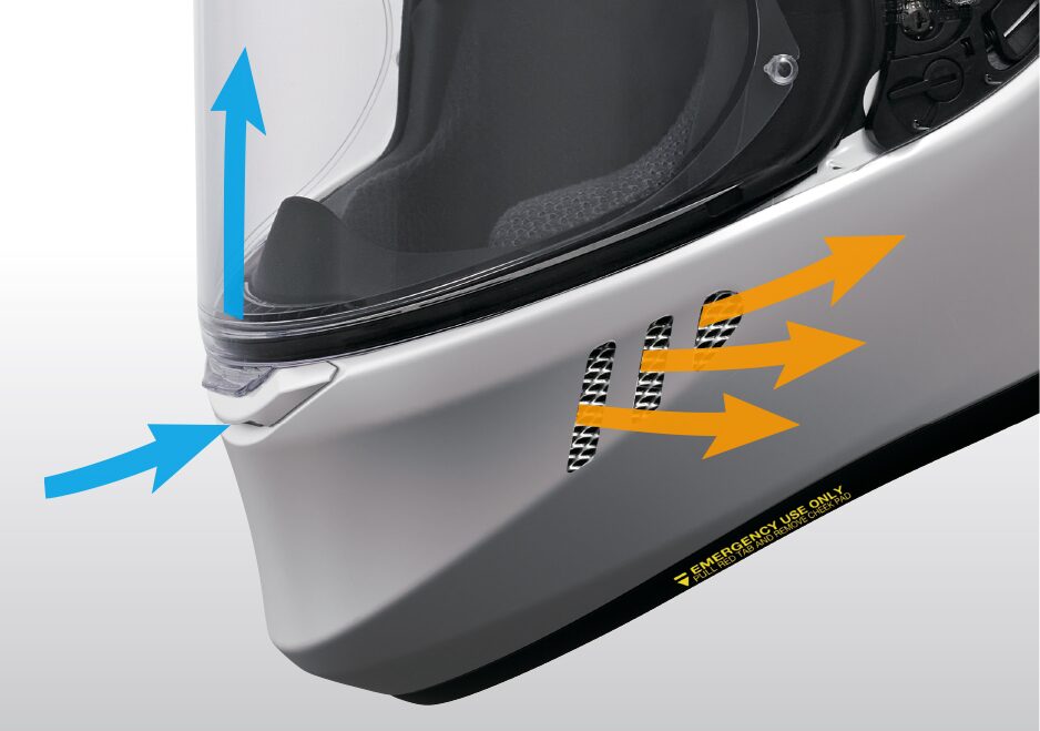 ライダーの救護を必要とする万が一の事態に、第三者による救護活動をより迅速に行えるよう装備されたシステム。救護時は迅速さが求められる一方で、ライダーからヘルメットを脱がすには慎重さが求められます。E.Q.R.S.はチークパッドに専用のリボンを装備し、救護時にこのリボンを引くことで簡単にチークパッドをヘルメットから外すことができ、頬部をホールドするチークパッドを引き抜くことで、ライダーからヘルメットを容易に脱がすことが可能です。