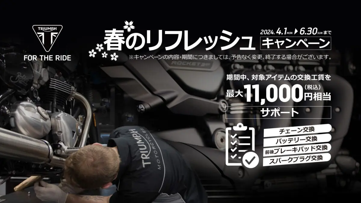 トライアンフモーターサイクルズジャパン株式会社は、対象アイテムの交換工賃を最大11,000円相当(税込)サポートする「春のリフレッシュキャンペーン」を開始した。