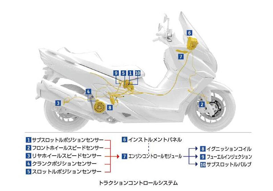 2021 年には新たにトラクションコントロールを装備し、エンジン出力を効率よく路面に伝えることが可能に。また、エンジンにスズキデュアルスパークテクノロジー※の採用やインジェクターを高微粒化タイプに変更することで燃焼効率の向上を実現し、平成32年(令和2年)国内排出ガス規制に対応しながらも高級感のあるフィーリングを実現しました。