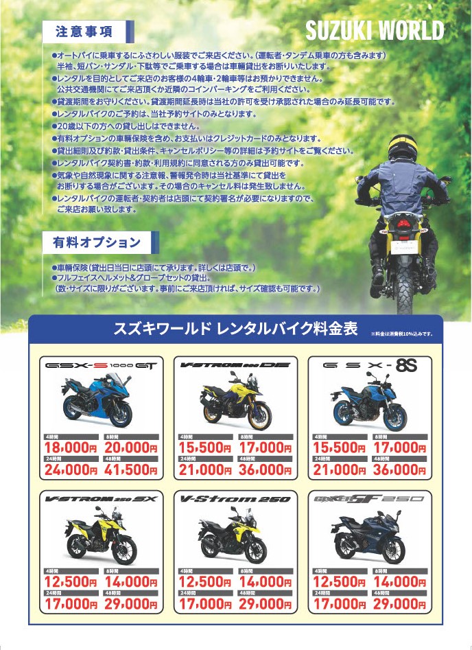 など、ぜひ当社のスズキワールド・レンタルバイクをご利用ください。