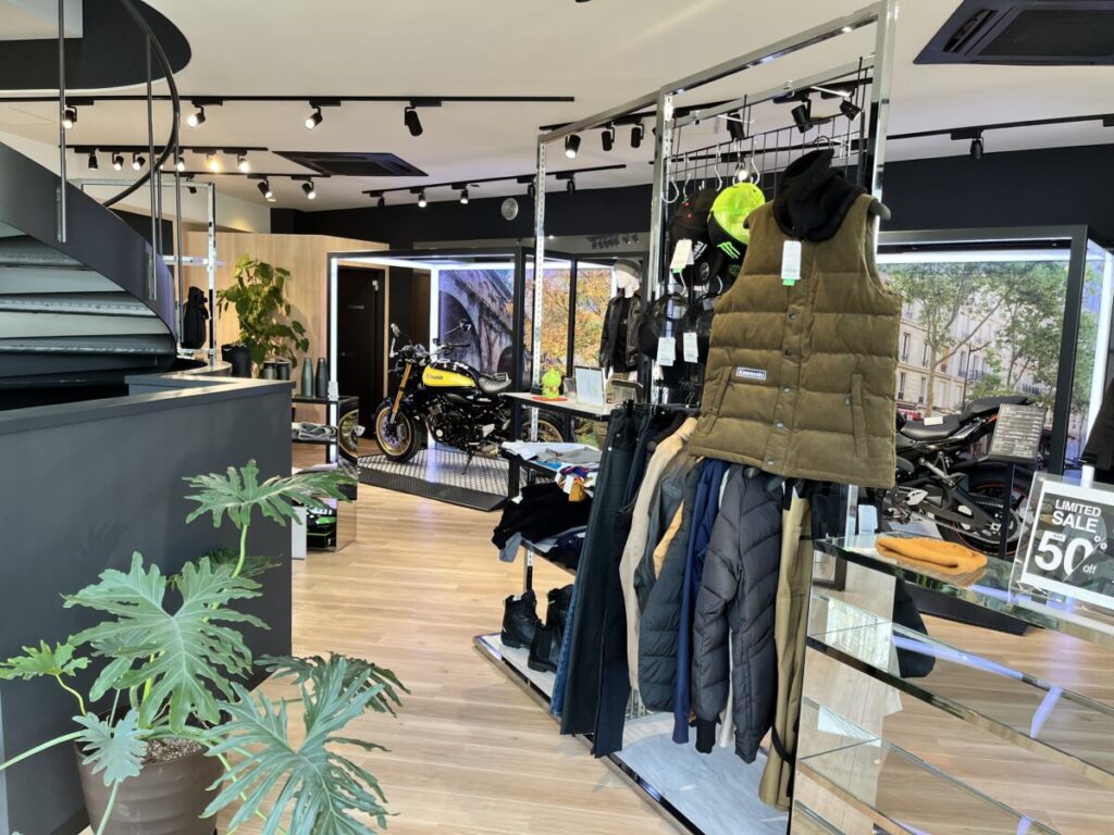 木目調のフロアが温かみを感じさせる明るい店内。モーターサイクルとプラザアパレルがゆったりと展示され、どなたでも楽しめる空間としています。