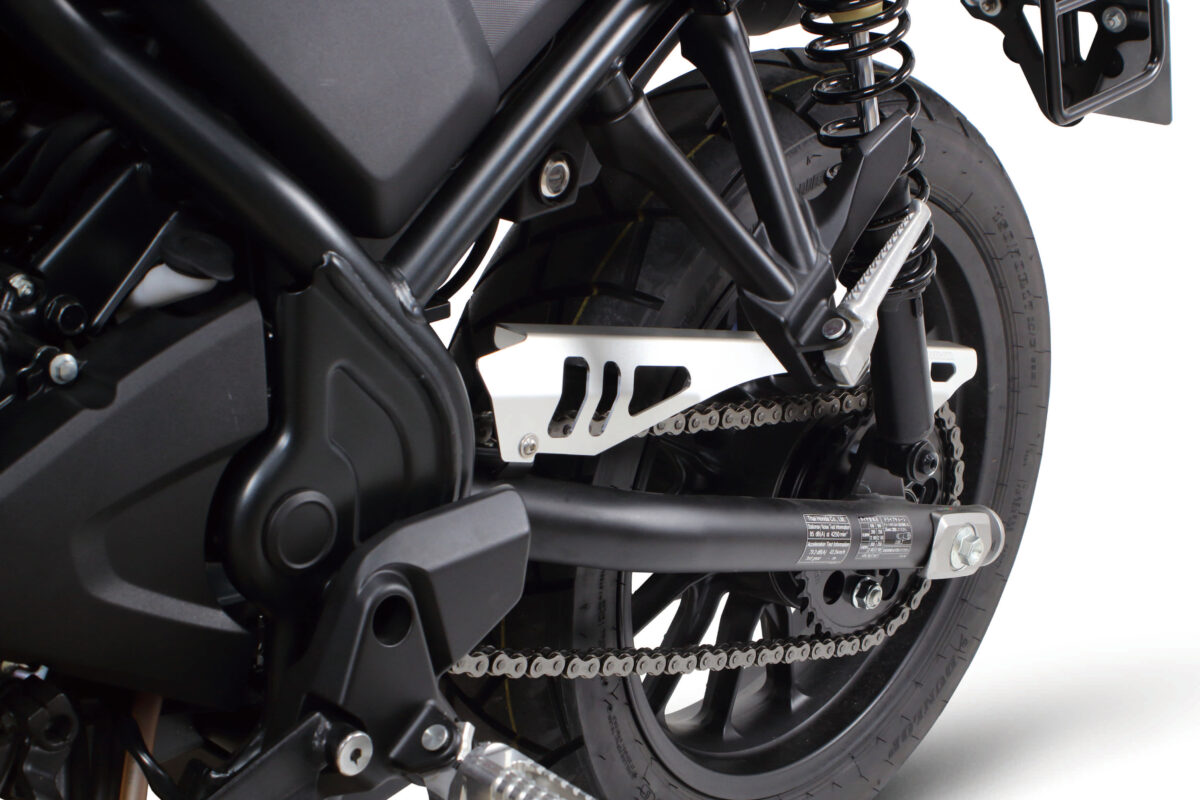 ノーマルとは異なるシャープなデザインを採用し、リア周りをスタイリッシュにまとめる“アルミチェーンガード”新登場!!