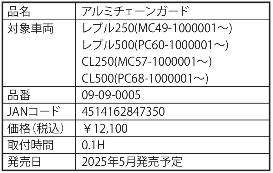 株式会社スペシャルパーツ武川は、ホンダ「レブル250」などに対応する新製品「アルミチェーンガード」を発売した。