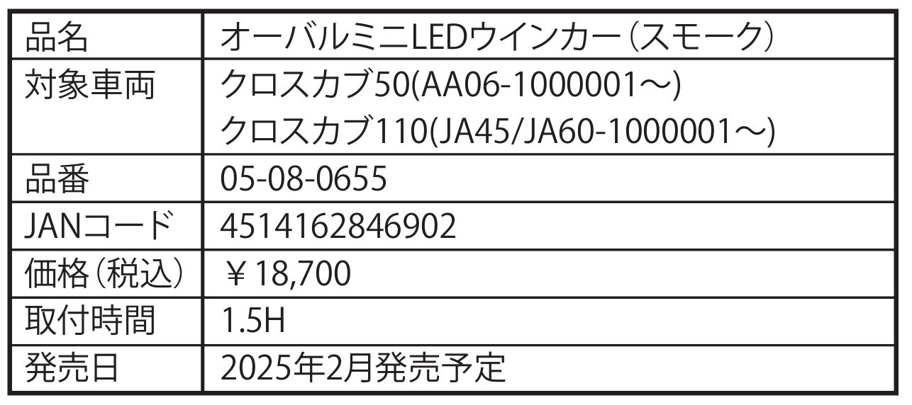 株式会社スペシャルパーツ武川は、クロスカブ50/110専用の「オーバルミニLEDウインカー(スモーク)」を発売した。