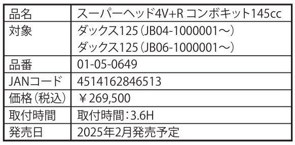 株式会社スペシャルパーツ武川は、ホンダDAX125用の「スーパーヘッド4V+R コンボキット145cc」を発売した。