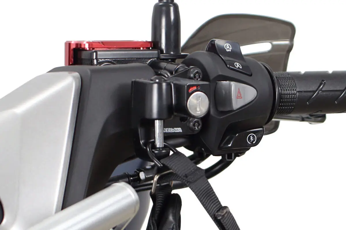 ハンドル周りにヘルメットを装着することで、隣接した車両への干渉防止や駐車スペースの確保など、オートバイの利便性が向上します。