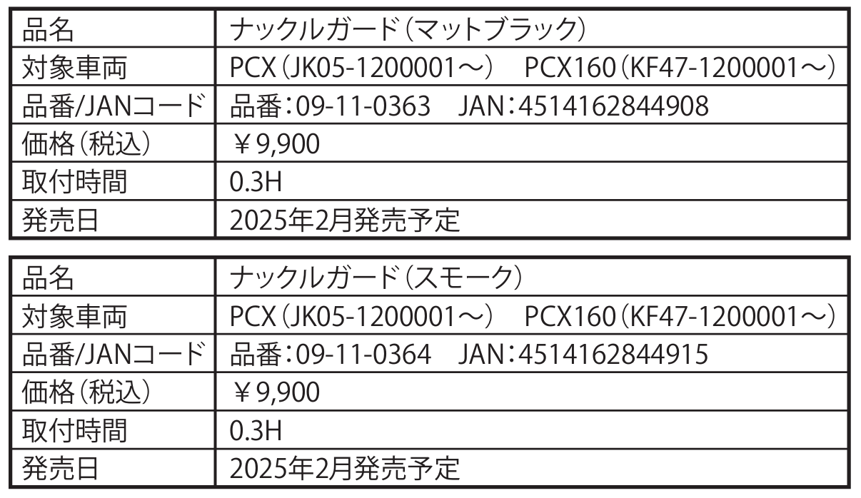 「ヘルメットホルダーセット」は、純正フロントブレーキマスターシリンダーにあるホルダー部分に装着でき、セキュリティーを高めるため盗難抑止対策ボルトを採用しているのが特徴だ。また「ナックルガード」は、手元を守るほか、風防効果もあるため雨風から手元をカバーすることが可能である。カラーはマットブラックとスモークの2色展開となる。