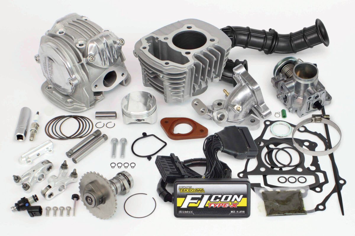 スーパーヘッド4V+Rコンボキット145ccは、スーパーヘッド4V+RボアアップキットにFIコン TYPE-X(インジェクションコントローラー)、 ビッグスロットルボディーキット Φ28、大容量フューエルインジェクター(G-1)、#8スパークプラブが付属しています。