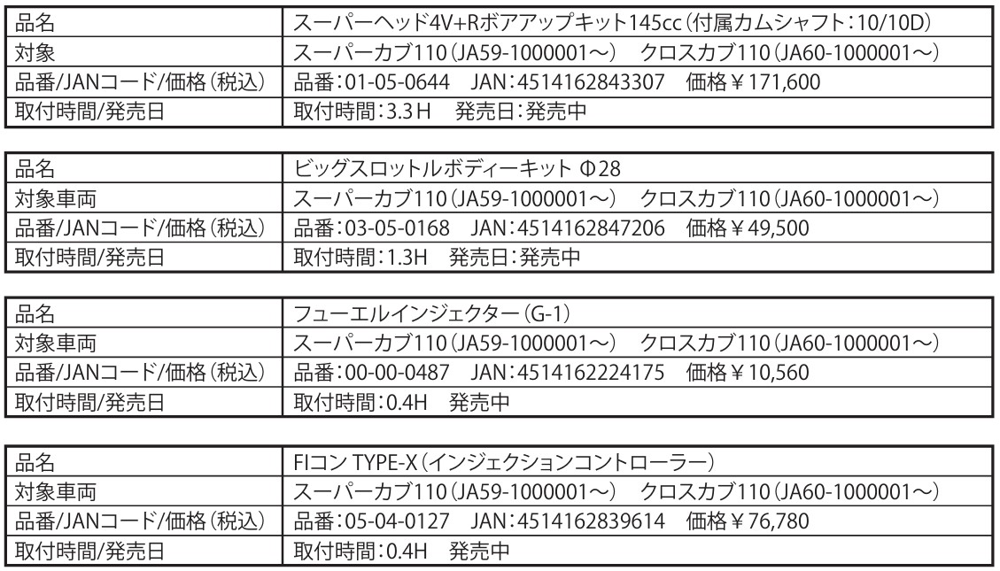 | 対象車両 | スーパーカブ110(JA59-1000001~) クロスカブ110(JA60-1000001~) |