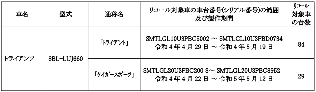 フロントサスペンションのトップキャップにおいて、製造加工が不適切なため、そのキャップの固定が不十分なものがあり、そのままの状態で使用を続けると走行振動等によりトップキャップが外れ、サスペンションが機能しなくなり、走行不能になるおそれがあるという。対象車はトライデントが84台、タイガースポーツが29台であり、使用者へはダイレクトメールにて通知される。
