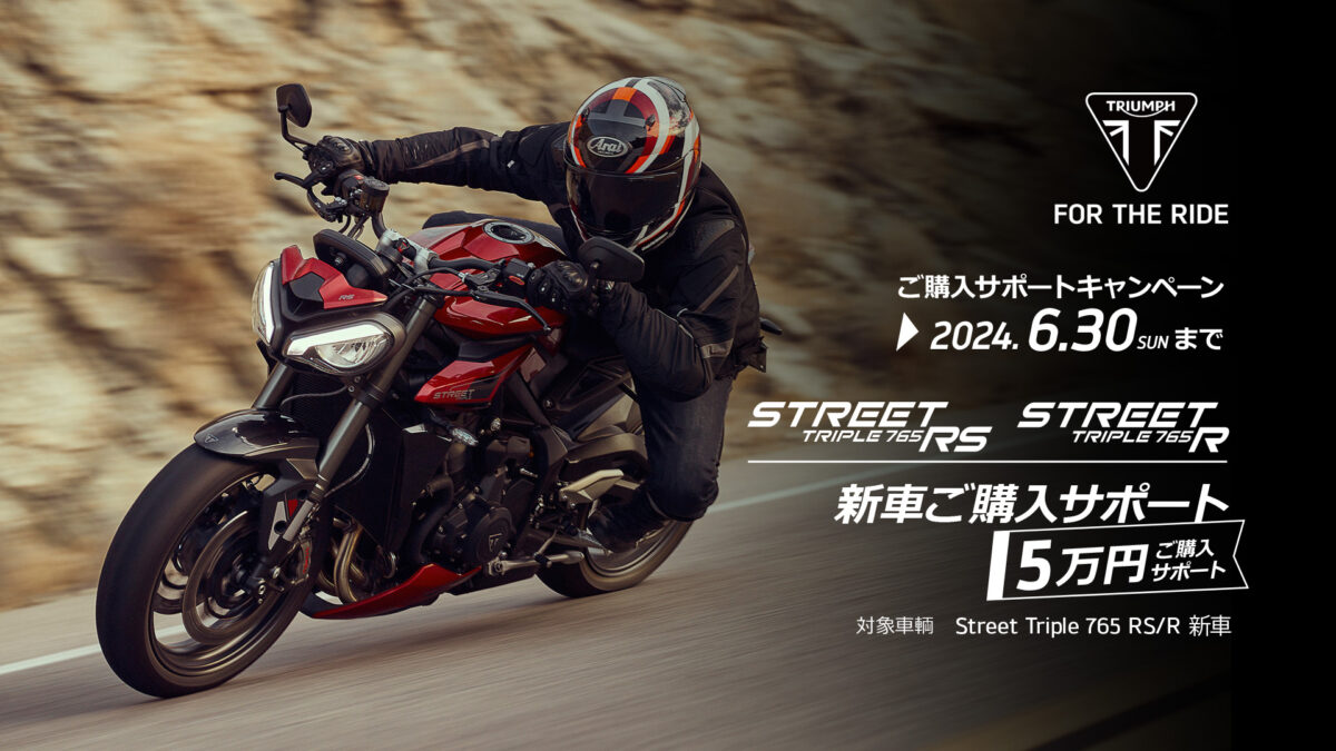 内容:Street Triple 765 RS/R をご成約いただいた方を対象に、最大 5 万円分の特別購入サポート