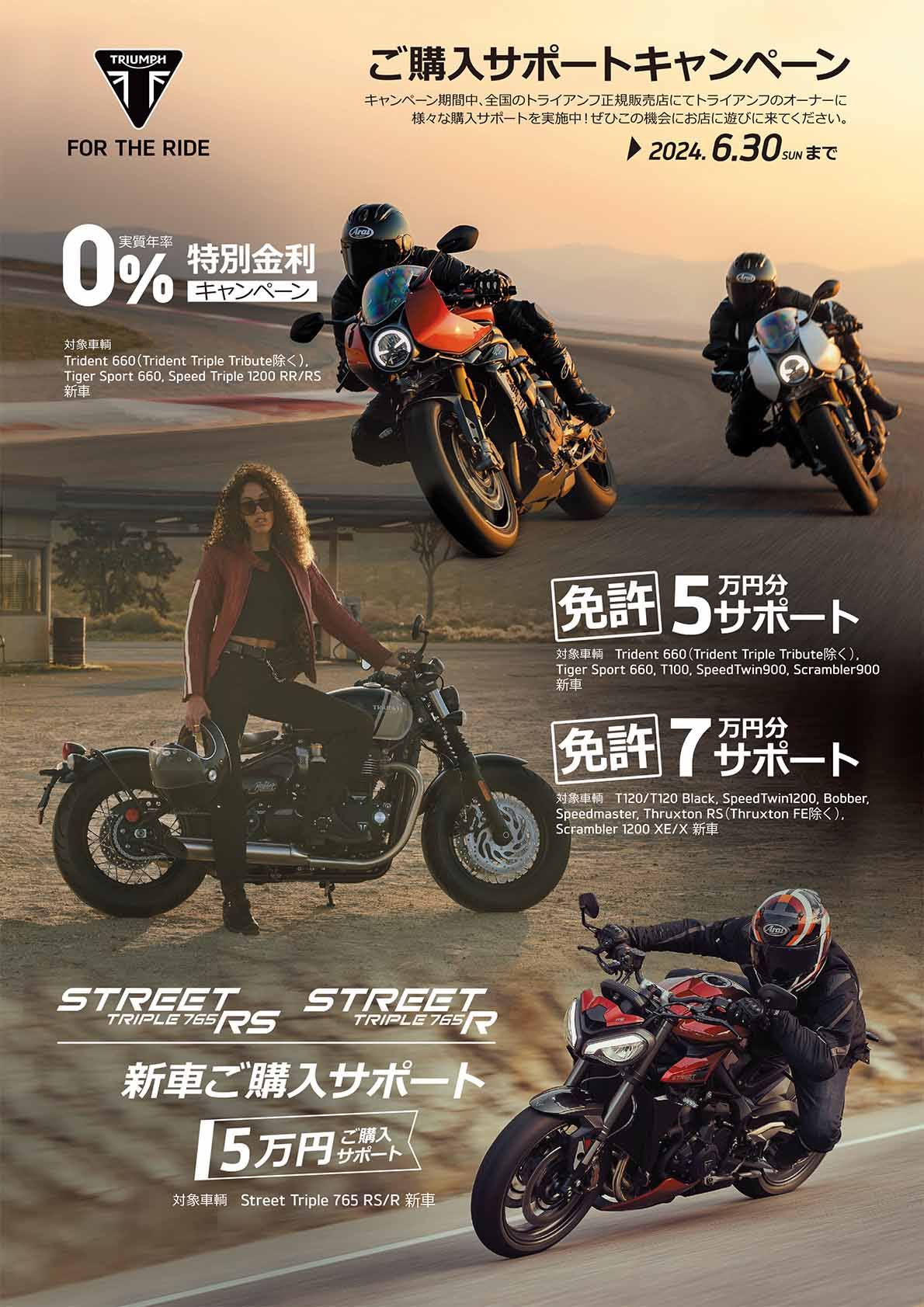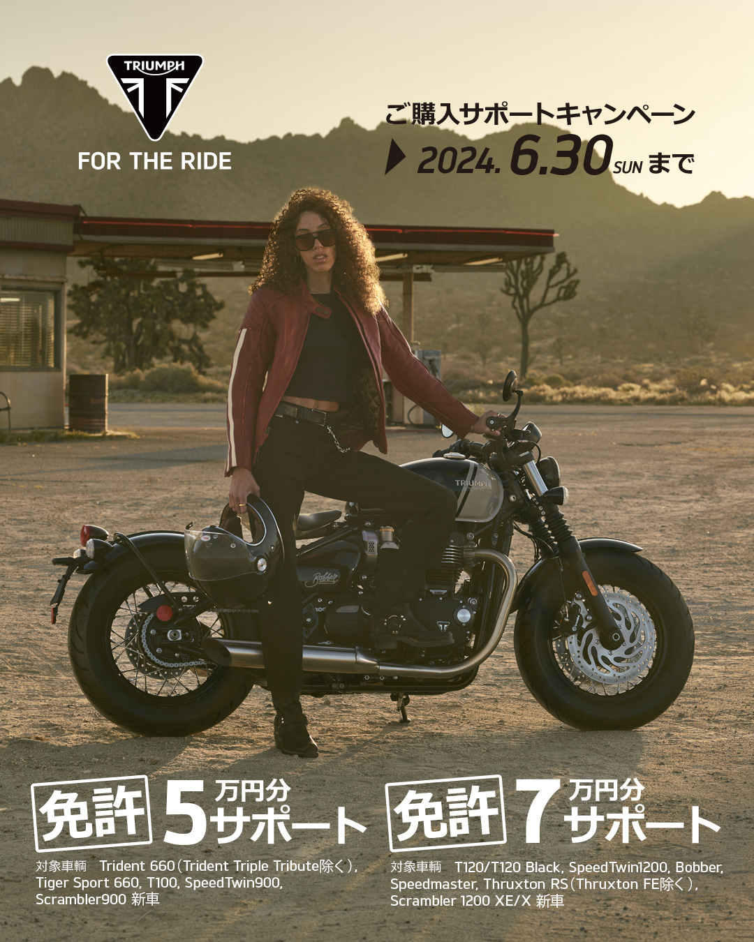 内容:キャンペーン期間中、全国のトライアンフ正規販売店にて対象車両をご成約・ご登録された方、且つ 2024年 1 月以降に大型自動二輪 MT 免許を取得された方、または 2024 年 9 月末までに取得される方を対象に、大型自動二輪 MT 免許取得費用相当分としてそれぞれ