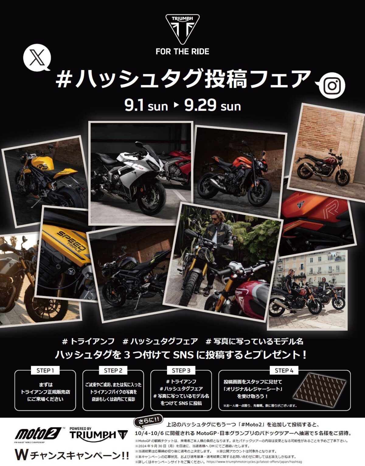 トライアンフモーターサイクルズジャパン株式会社は、2024年9月1日(土)~9月29日(日)までの期間中、初秋のキャンペーンとして全国のトライアンフ正規販売店にて「#ハッシュタグ投稿フェア」を開催中だ。