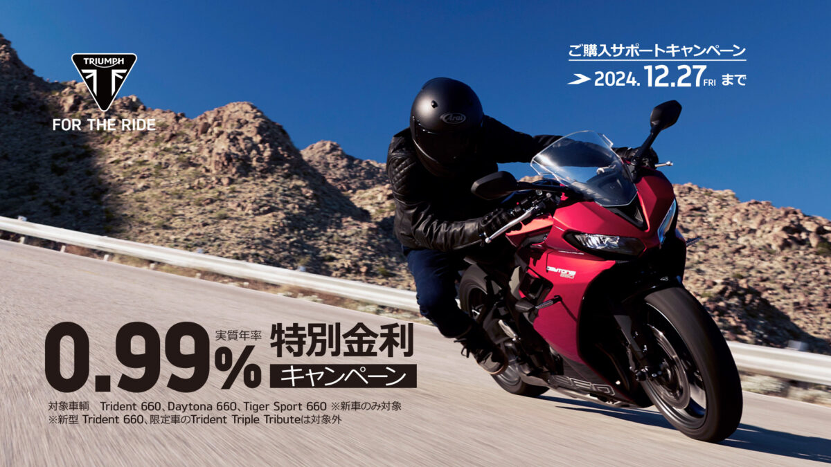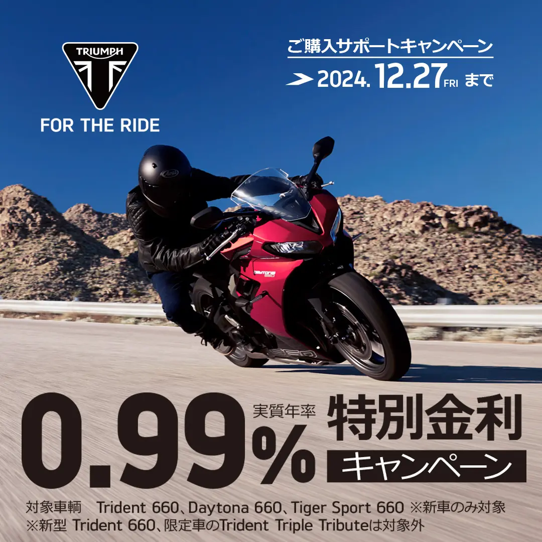 内容:キャンペーン期間中、全国のトライアンフ正規販売店にて対象車両をご成約、且つローン契約を完了していただいたお客様に、「0.99% 特別金利ローン」をご提供します。