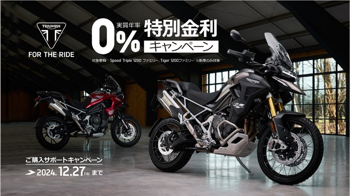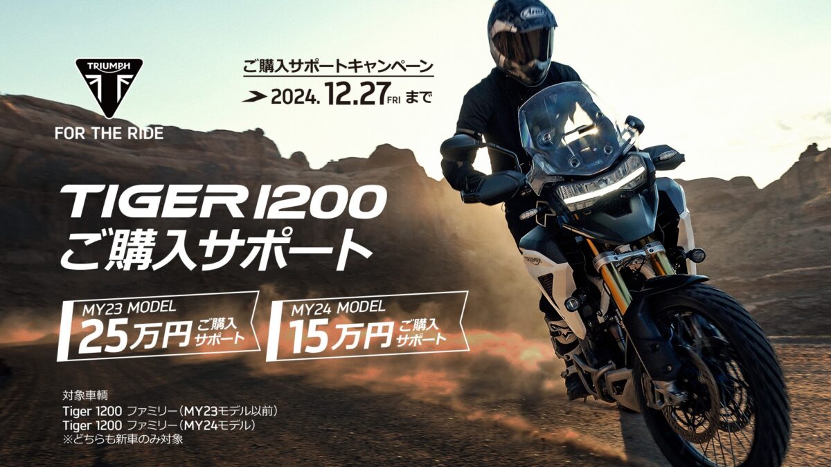 TIGER 1200ファミリーの新車をご成約いただいた方に、最大25万円分のご購入サポートが登場!