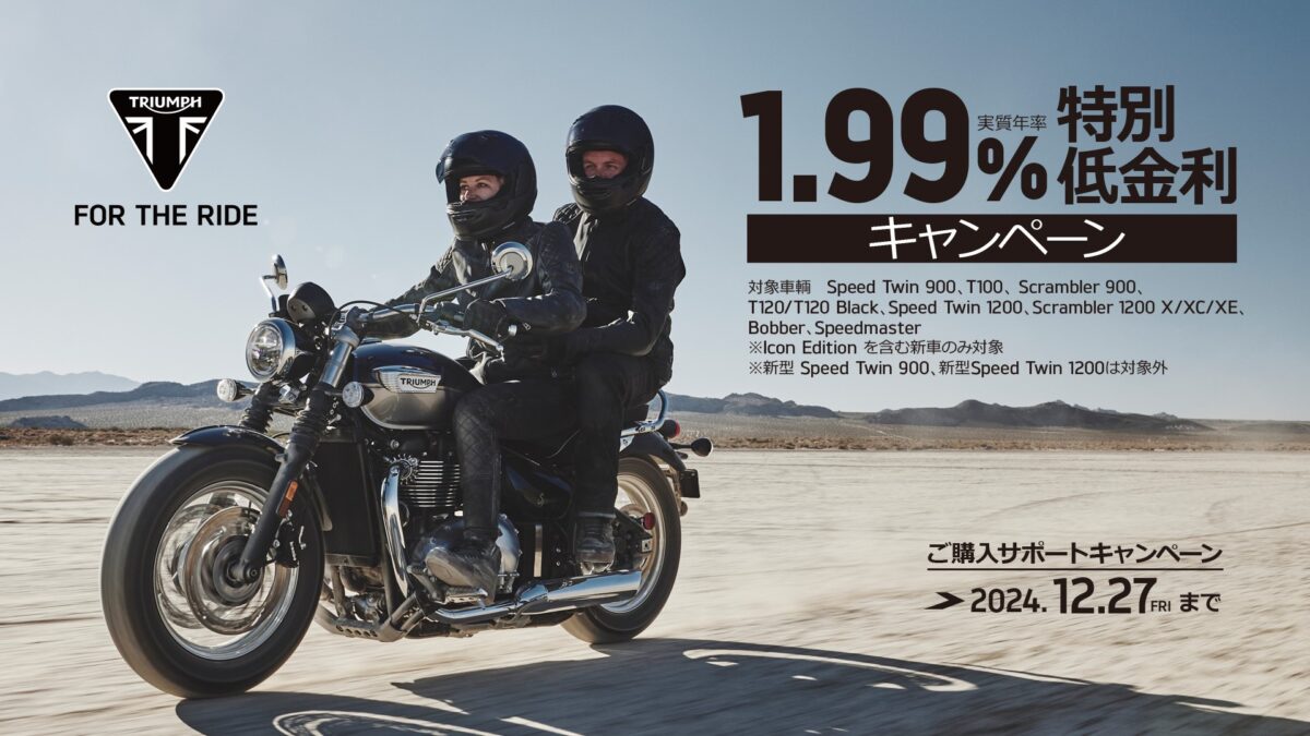 内容:キャンペーン期間中、全国のトライアンフ正規販売店にて対象車両をご成約、且つローン契約を完了していただいたお客様に、「1.99% 特別金利ローン」をご提供します。