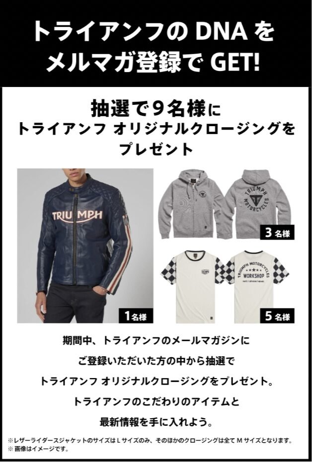 さらに、期間中にメルマガ登録をされた方の中から、抽選で9名様にトライアンフ オリジナルクロージングをプレゼントいたします。