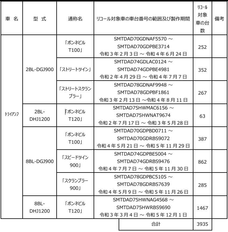 トライアンフ モーターサイクルズ ジャパン株式会社(本社:東京都港区海岸 代表取締役:大貫陽介)は、次の内容をセーフティーリコールとして国土交通省へリコール届出をいたしました。