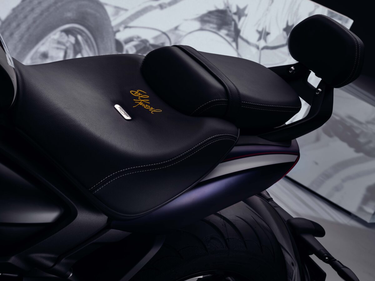 クロームメッキされた燃料タンクのデザインは、彼のアイコンである爽やかな白いジャンプスーツと星条旗のグラフィックからインスピレーションを得ており、タンクとは対照的なマットサファイアブラックがマッチングされたリアパネルには、イーベル・クニーヴェルのロゴがゴールドの刺繍で施されたレザーシートが組み合わされ、非常に大胆で印象的な外観となります。