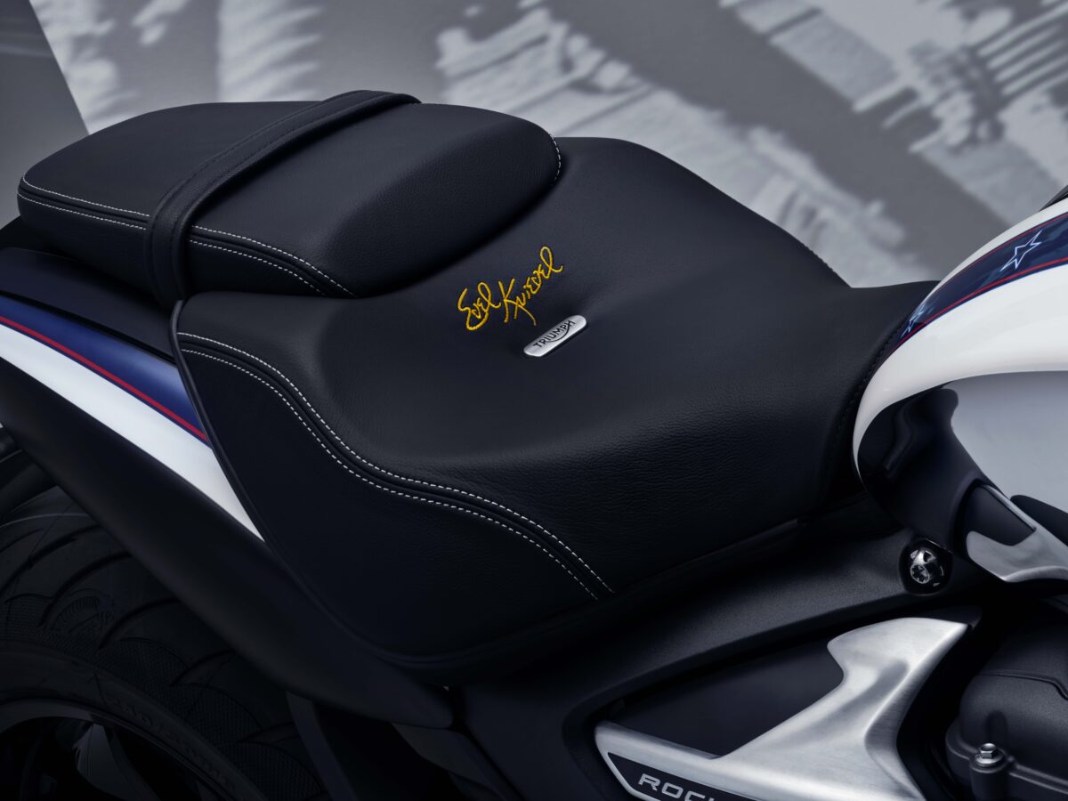 プレミアムレザーシートにはイーベル・クニーヴェルのサインがゴールドで刺繍され、ブラッシュドアルミニウムのトライアンフバッジがはめ込まれています。