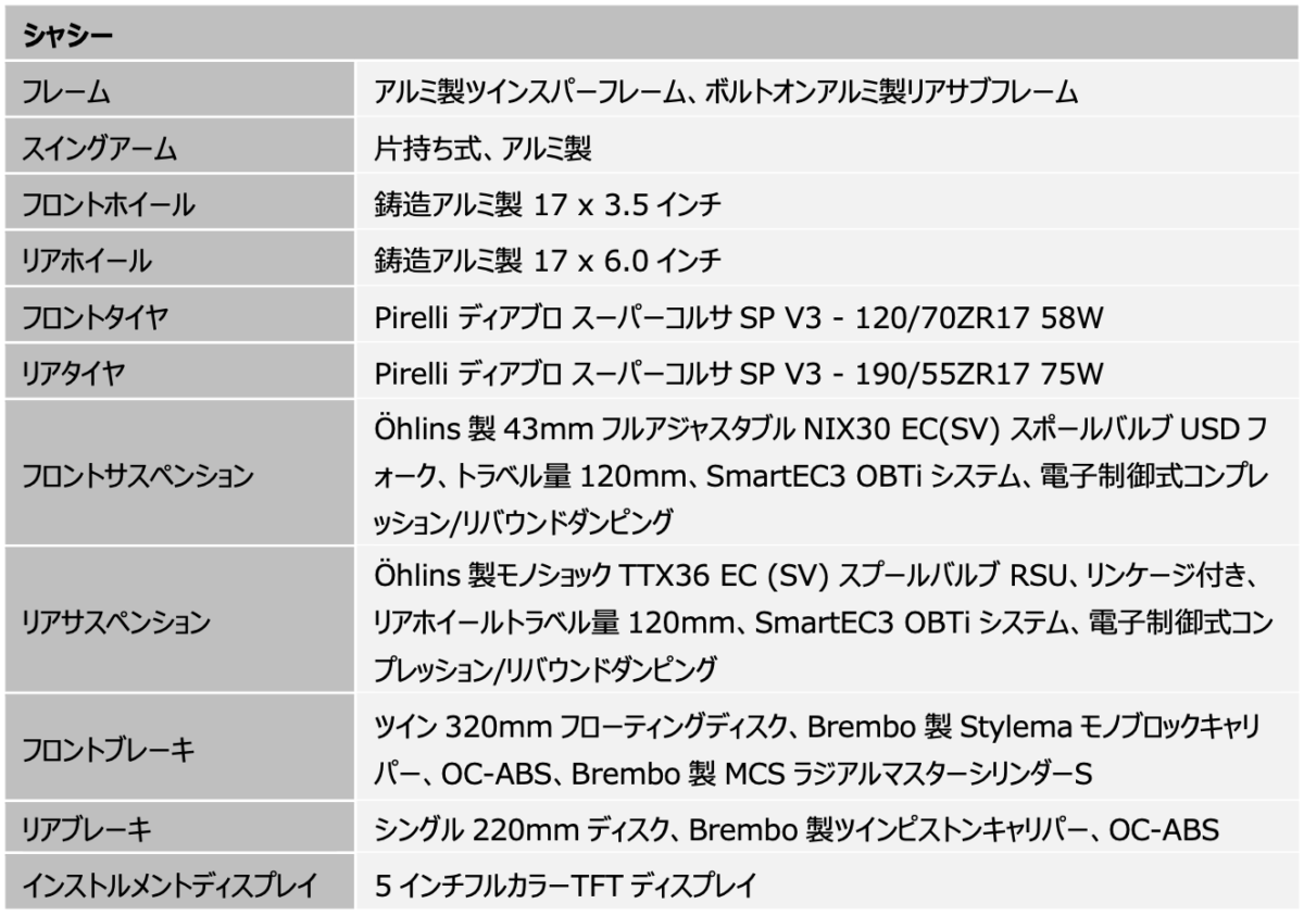 タイヤは、ピレリ製ディアブロ・スーパーコルサSP V3を装着。レーストラックでのパフォーマンスを発揮しつつ、公道でも安心したライディングフィールをもたらします。