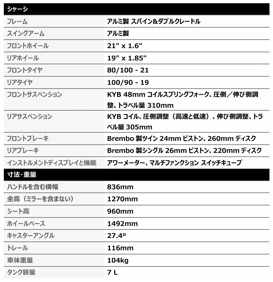 リンケージシステムは、安定したサスペンション性能を確保し、ミッドストロークコントロール、シャシーバランス、コーナリングの安定性の向上を実現するようにチューニングされています。この高性能セットアップは、KYB 48mm AOSコイルフォーク、鍛造および機械切削加工された7075-T6アルミニウムトリプルクランプ、および3ウェイピギーバックコイルリアショックによって完成されます。