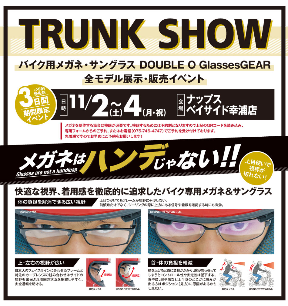 この度、バイク専用メガネの体験ができるイベント、「TRUNK SHOW」が下記にて開催される事となった。