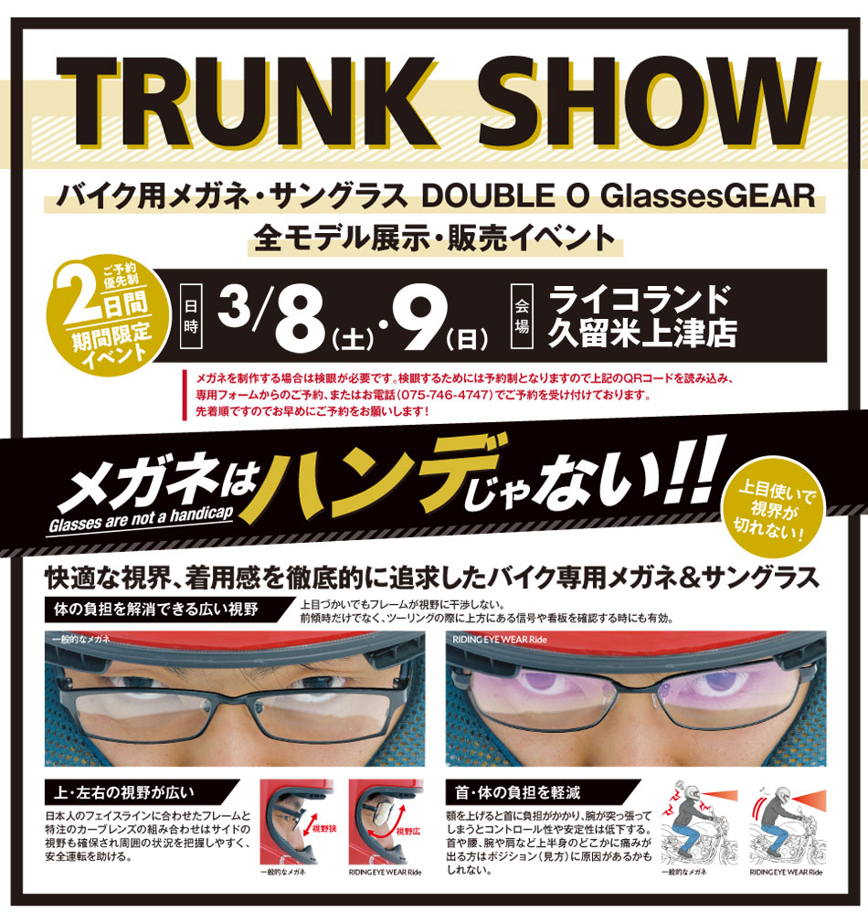 この度、バイク専用メガネの体験ができるイベント、「TRUNK SHOW」が下記にて開催される事となった。