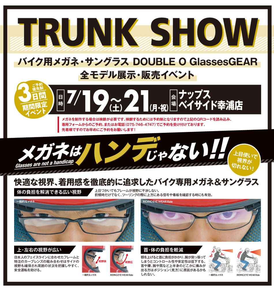 この度、バイク専用メガネの体験ができるイベント、「TRUNK SHOW」が下記にて開催される事となった。