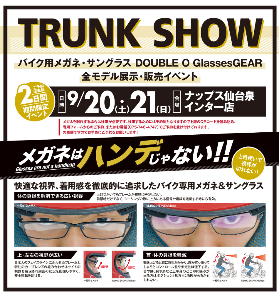この度、バイク専用メガネの体験ができるイベント、「TRUNK SHOW」が下記にて開催される事となった。