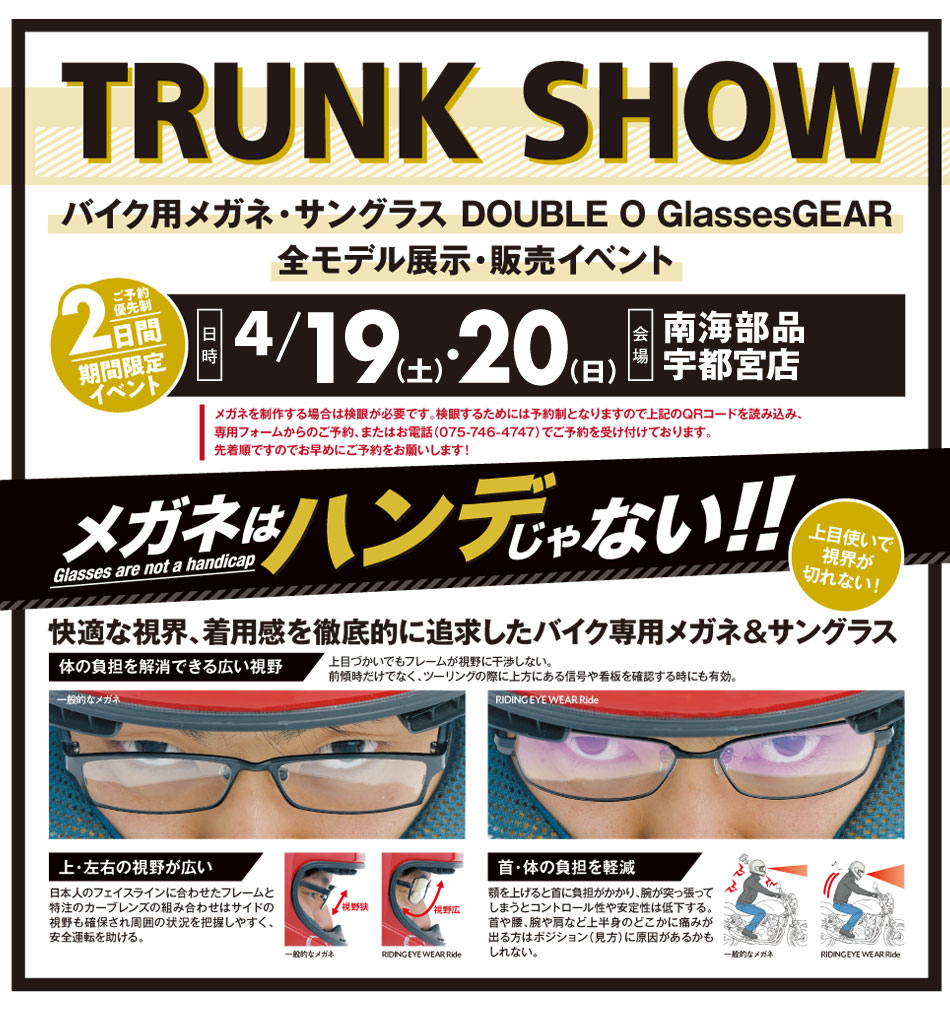 この度、バイク専用メガネの体験ができるイベント、「TRUNK SHOW」が下記にて開催される事となった。