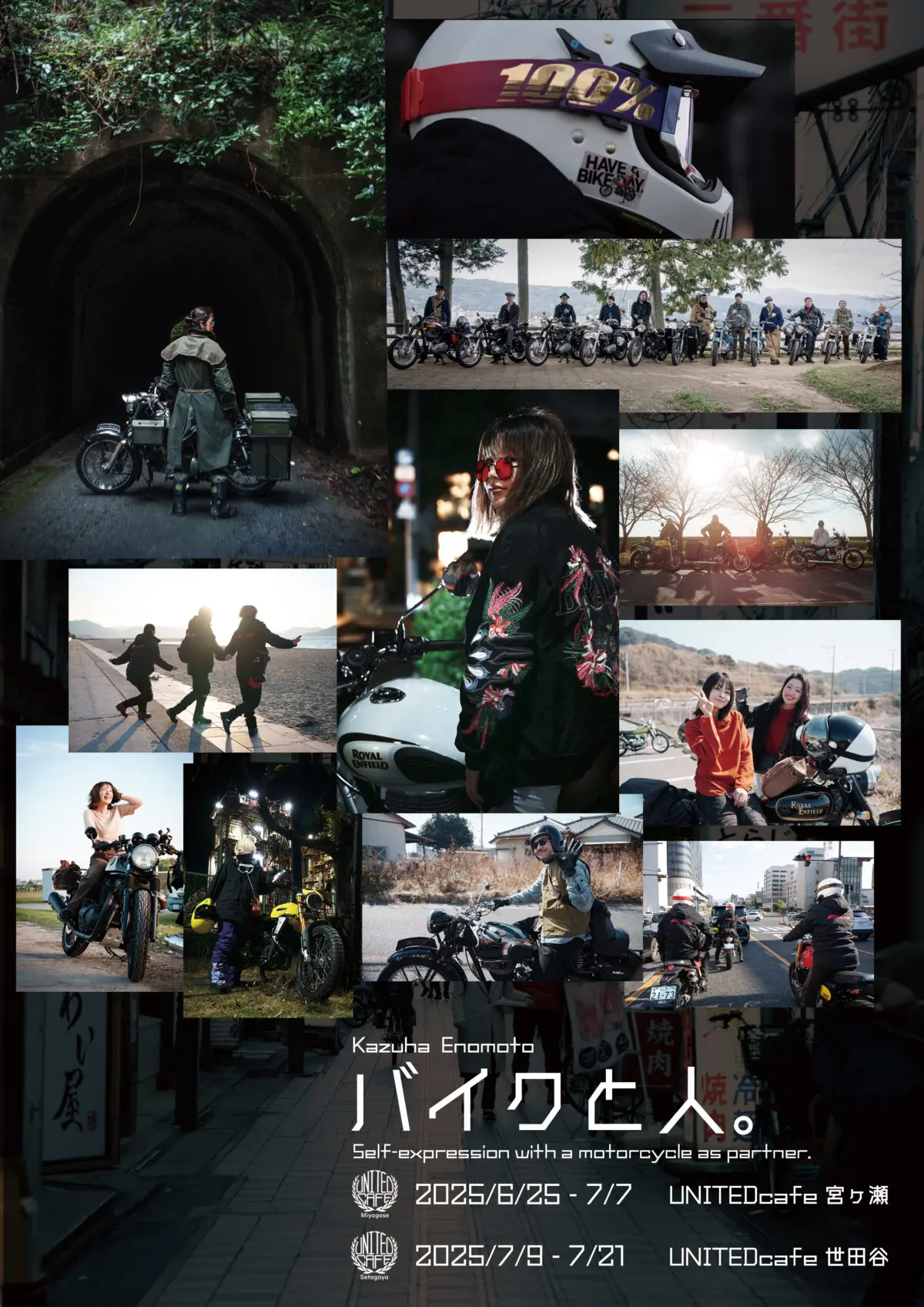 ユナイテッドカフェを運営する株式会社ユナイテッド・アーツは、Kazuha Enomoto氏による展示会『バイクと人。』を、2025年6月25日から宮ヶ瀬、7月9日から世田谷にて開催する。